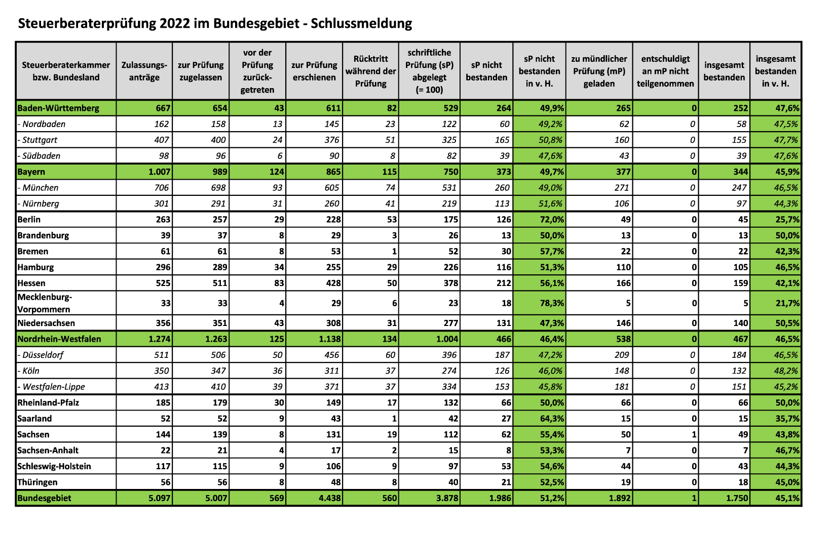Untenstehend finden Sie eine Tabelle mit den Prüfungsergebnissen aus dem Jahr 2022/2023 (Quelle: https://media.nwb.de/hp/NWB_de/Downloads/StB_Examen_2022_.pdf). Hier lag die offizielle Bestehensquote bei ca. 45 %. Bei dieser Quote wurden nur die Teilnehmer gewertet, die auch tatsächlich ihre Klausur abgegeben haben. Bezieht man jedoch auch die Zurückgetretenen mit ein, ergibt sich eine Bestehensquote von lediglich ca. 39,5 %. Aber keine Panik: Verlieren Sie nicht den Mut, denn es ist letztlich egal, wie viele im Durchschnitt bestehen, solange Sie selbst bestehen!